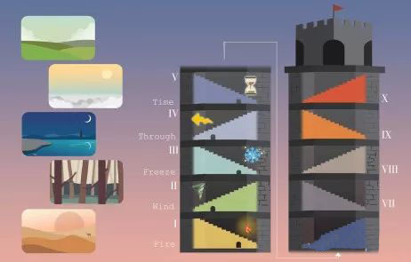 整個游戲是在一個高塔中進行的,每一層都是每一個環(huán)節(jié),總共十層。左邊的五個場景是主角的幻影場景。