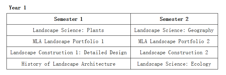 第一年第一個(gè)學(xué)期由一些基礎(chǔ)課程組成,包括植物課程、一個(gè)較為簡(jiǎn)單的設(shè)計(jì)項(xiàng)目、景觀施工基礎(chǔ)以及景觀建筑史四門課程: