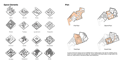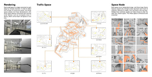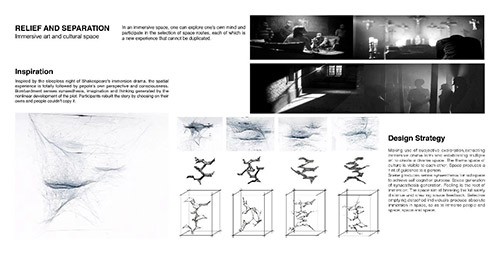 放空和抽離――浸入式空間探索。這是第一次對于學科交叉跨界的實驗性設計,靈感來源于莎士比亞浸入式戲劇不眠之夜,以人主觀意識跟隨角色進入視角。人們可以自主選擇路線,以劇情的非線性發(fā)展產(chǎn)生自我的想象和思考。參與者將故事提煉重構,無法復制。設計策略:1.提取浸入式戲劇碎片化形式,在整體空間制造不同場景,建立多重具備獨立性的藝術文化主題空間。2.抓住浸入式戲劇“不完整卻清晰”的特征,提取相互浸入的蛛網(wǎng)元素以規(guī)劃整體場景線路的錯綜,建立多層次室內(nèi)路徑,場景間具備可視性。3.浸入式戲劇的誕生源于人們“極致體驗感”,局部空間適當突破常規(guī)尺寸限制,打破安全距離,制造空間反饋。4.為達到放空和抽離后的自我認知目的,大整體提取歐洲巴別塔建筑形式,延伸空間高度,弱化立面層次關系,空間形態(tài)具備儀式感。設計目的:空間與空間的浸入、人與空間的浸入。