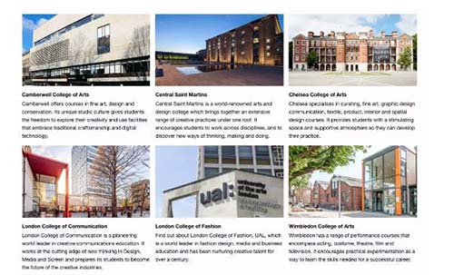 倫敦藝術(shù)大學(xué)University of the Arts London, 原名:倫敦學(xué)院 (The London Institute) 成立于1986年,是全世界最優(yōu)秀的藝術(shù)學(xué)院之一,將世界上最著名的致力于藝術(shù)、設(shè)計(jì)及其它相關(guān)活動(dòng)的六所學(xué)院聯(lián)合起來(lái)。