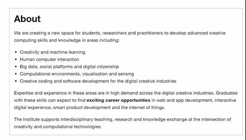 正如他們自己所說(shuō)的:數(shù)字創(chuàng)意產(chǎn)業(yè)對(duì)這些領(lǐng)域的專業(yè)知識(shí)和經(jīng)驗(yàn)有很高的要求,擁有這些技能的畢業(yè)生可以在網(wǎng)絡(luò)應(yīng)用程序開(kāi)發(fā),交互式數(shù)字體驗(yàn),智能產(chǎn)品開(kāi)發(fā)和物聯(lián)網(wǎng)中找到很好的求職機(jī)會(huì)。而該研究所也會(huì)在創(chuàng)造力和計(jì)算機(jī)技術(shù)的交叉點(diǎn)支持跨學(xué)科教學(xué),研究和知識(shí)交流。