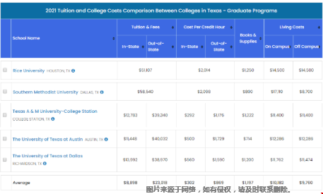 在得克薩斯州的研究生,州外學(xué)生平均學(xué)雜費(fèi)為每年$23,018,平均校內(nèi)住宿費(fèi)為每年$10,182,平均校外住宿費(fèi)為每年$9,780。得克薩斯州位于美國的南部,生活成本相對低廉。