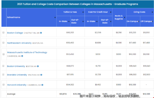 在馬薩諸塞州的研究生,州外學(xué)生平均學(xué)雜費(fèi)為每年$36,386,平均校內(nèi)住宿費(fèi)為每年$15,020,平均校外住宿費(fèi)為每年$12,330。其中,東北大學(xué)和波士頓大學(xué)的校內(nèi)外住宿費(fèi)基本保持一致,而麻省理工學(xué)院的校外住宿費(fèi)用則外校內(nèi)住宿的2倍。