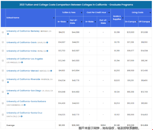 在加州的研究生,州外學(xué)生平均學(xué)雜費(fèi)為每年$26,383,校外住宿費(fèi)平均為每年$14,404。以加州系大學(xué)為例,不同學(xué)校的學(xué)雜費(fèi)區(qū)別不大,但是住宿費(fèi)與學(xué)校所在城市生活水平有關(guān)。其中,加州大學(xué)伯克利分校的住宿費(fèi)最高,校內(nèi)住宿費(fèi)為每年$20,530,校外住宿費(fèi)為每年$15,638。