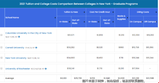 在紐約州的研究生,州外學(xué)生平均學(xué)雜費(fèi)為每年$29,726,平均校外住宿費(fèi)為每年$13,588。而中國學(xué)生熱門院校如哥倫比亞大學(xué),紐約大學(xué),康奈爾大學(xué),羅切斯特大學(xué)都是私立院校,學(xué)費(fèi)相對較高。哥大和紐大由于位于紐約市,住宿費(fèi)也相對較高了。