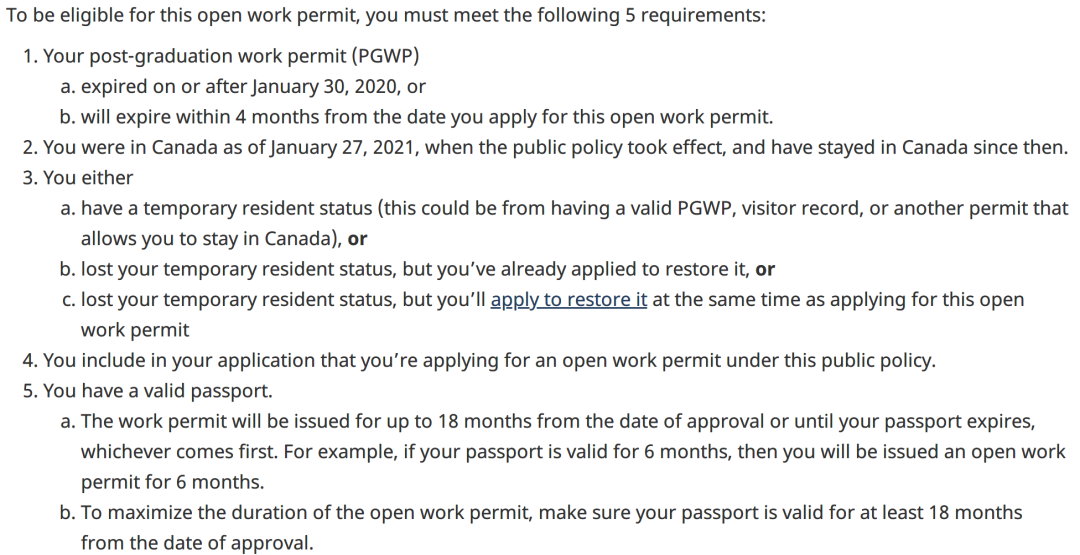 你現(xiàn)有的PGWP是在2020年1月30后過(guò)期的,或現(xiàn)在的PGWP將會(huì)在4個(gè)月內(nèi)過(guò)期,從這一點(diǎn)要求來(lái)看,只要你的PGWP是在2020年1月30日至2021年11月27日間到期的都符合要求。