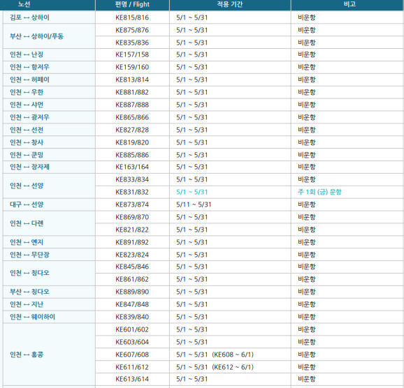 根據(jù)大韓航空官網(wǎng)4月24日最新發(fā)布的公告,大韓航空將暫時(shí)關(guān)閉/取消以下中韓航線。(除非另有說明)