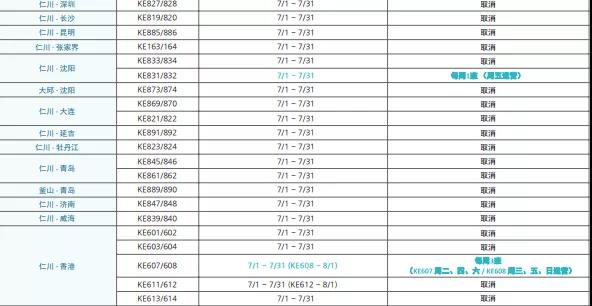 根據(jù)大韓航空官網(wǎng)6月18日最新發(fā)布的公告,7月份大韓航空將暫時(shí)關(guān)閉/取消以下中韓航線。(除非另有說明)