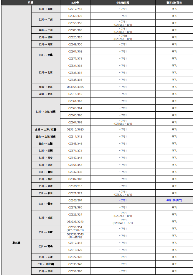 根據(jù)韓亞航空公布的最新航班信息來(lái)看,7月份韓亞航空僅保留了仁川-長(zhǎng)春的OZ303/304航班,仁川-香港的OZ721/722航班以及仁川-臺(tái)北的QZ711/712航班。