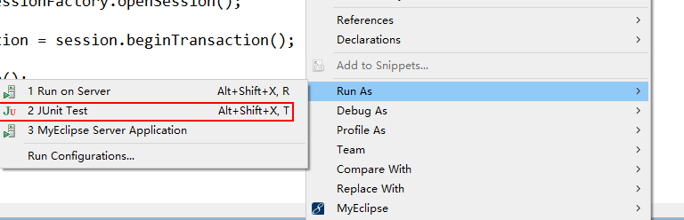 在 UserTest 類中,右擊 testInsert() 方法,在彈出的快捷菜單中選擇 Run As→JUnit Test 選項(xiàng)運(yùn)行測(cè)試,如圖所示。