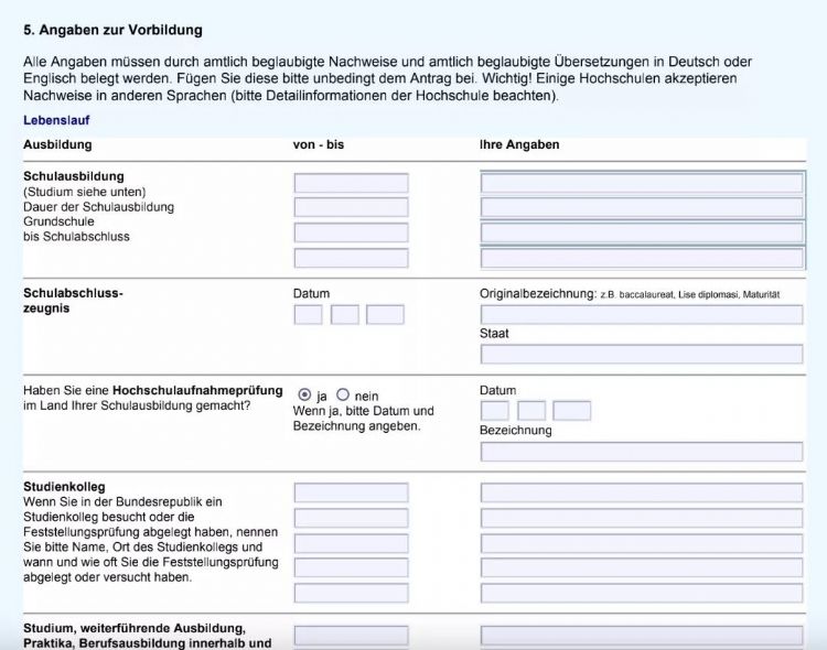 Vorbildung 在這里是指在申請德國大學入學之前的學歷。其中在要填寫“高中畢業(yè)證書的名稱”和“獲得證書的地點和日期”;是否參加過“高考”,如果參加過“全國統(tǒng)一高考”,則在Bezeichnung 之后填寫 National vereinheitlichte Hochschulaufnahmeprüfung (VR China)。