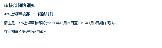 請留神,APS上海審核部將于2020年12月24日至2021年1月3日時期閉館。在此時期不受理簽證申請。
